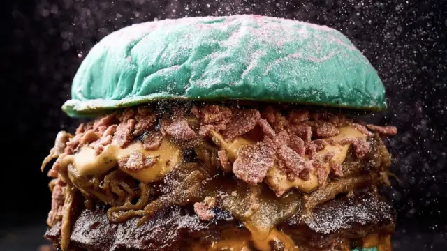 El 'Diamante Azul' lleva un pan brioche que destaca por su color azul, polvo de diamante y oro rosa. El relleno incluye un 'fat' smash madurado, costilla americana, mermelada de bacon, queso cheddar, bacon crujiente, mayonesa ahumada y una salsa especial Emmy.